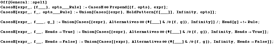 Off[General :: spel1] CasesH[expr_, {f___}, opts___Rule] := CasesH @@ Prepend[{f, opts}, expr] ; CasesH[expr_, f_, opts___Rule] := Union[Cases[{expr}, HoldPattern[f[___]], Infinity, opts]] ; <br /> CasesH[expr_, f___, g_] := Union[Cases[{expr}, Alternatives @@ (#[___] & /@ {f, g}), Infinity]] /; Head[g] =!= Rule ; <br /> CasesH[expr_, f__, Heads -> True] := Union[Cases[{expr}, Alternatives @@ (#[___] & /@ {f, g}), Infinity, Heads -> True]] ;  CasesH[expr_, f__, Heads -> False] := Union[Cases[{expr}, Alternatives @@ (#[___] & /@ {f, g}), Infinity, Heads -> False]] ;